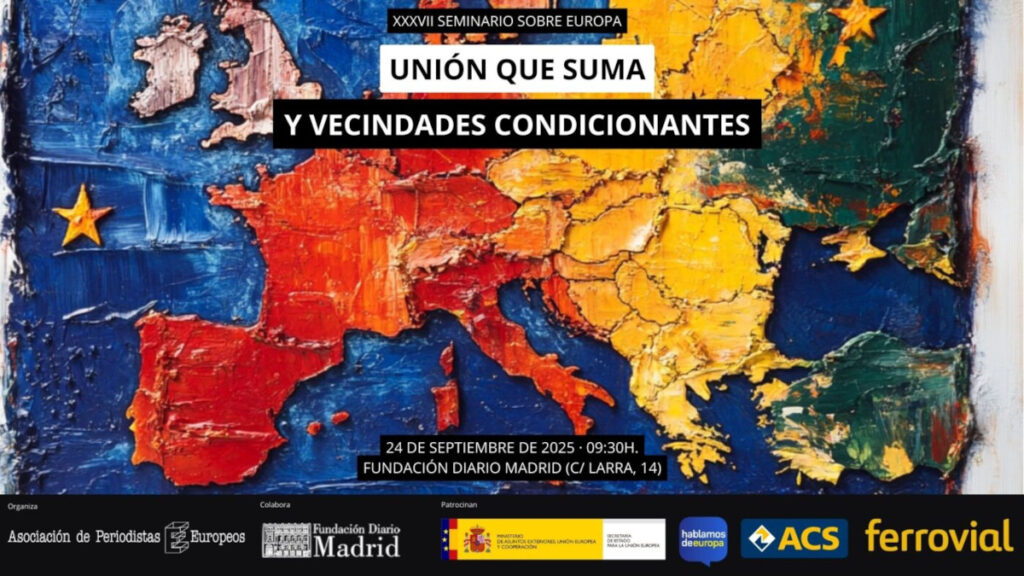 La Asociación de Periodistas Europeos organiza este miércoles 24 de septiembre, en la sede de la Fundación Diario Madrid (calle Larra, 14), una nueva edición de su Seminario sobre Europa, bajo el título “Unión que suma y vecindades condicionantes”. El encuentro cuenta con la colaboración del programa Hablamos de Europa del Ministerio de Asuntos Exteriores, Unión Europea y Cooperación y con el patrocinio de ACS y Ferrovial.